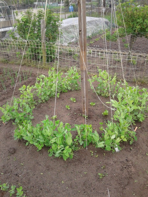 De kapucijners en doperwten groeien goed. Het wordt langzamerhand tijd dat ze zich vasthaken aan de geleidetouwen. Een van de sisaldraden was (in de grond) geknapt, dus dat is toch niet zo een goed idee, maar met een beetje geluk, zorgen de planten zelf voor de verbinding met de grond.